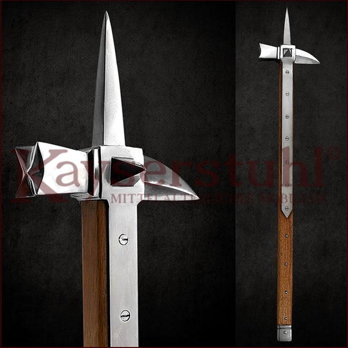 als auch zum Stechen eingesetzt werden kann. Eine Hellebarde