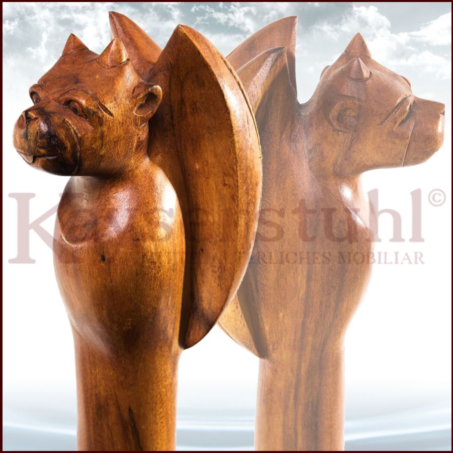 Unsere gesamten Schnitzereien sind meisterhafte Handarbeiten, die aus nachhaltigem Holz in kleinen Familienbetrieben auf Bali hergestellt werden. So gut sie da schnitzen können, so schlecht ist der Leim der zur Verfügung steht. Es kann deswegen in seltenen Fällen passieren, dass sich Köpfe von Wanderstäben ablösen und wieder festgeklebt werden müssen. Das ist leider unumgänglich, da die Wanderstäbe ressourcenschonend aus zwei Teilen hergestellt werden, dem Schaft und dem Kopf und da wir das nicht immer im Vorfeld erkennen können kein Umtauschgrund.