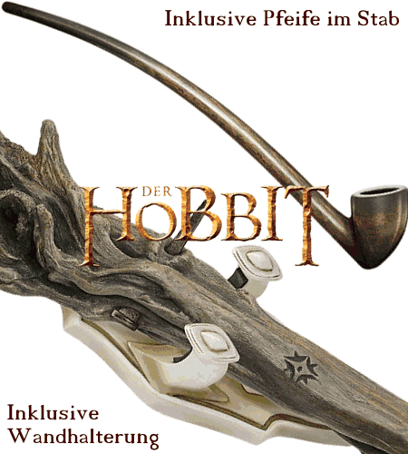 Offiziell lizensierte Filmreplik aus Der Hobbit - Die Schlacht der Fünf Heere von United Cutlery. Sonderedition des Stabs von Gandalf mit einem Kopf, der genauso wie im Film Der Hobbit: Smaugs Einöde leuchtet. Die Stabkrone ist mit einem durchsichtigen Gitterwerk ausgestattet, hinter welchem sich eine lichtstarke weiße LED (100 Lumen, 50.000 Std. Lebensdauer) verbirgt. Die Leuchtdiode lässt sich durch einen versteckten Knopf an der Seite des Stabs einschalten und läuft mit wechselbaren AA-Batterien, die unten am Fuße des Schaftes Platz finden (Batterielebensdauer ca. 20 Stunden).